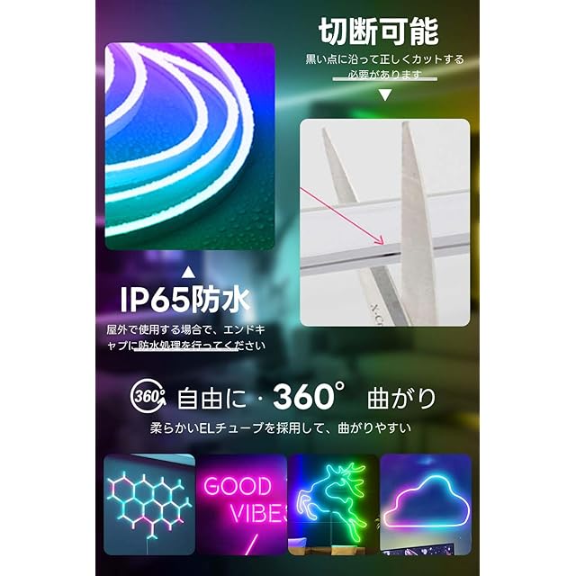 【防水&切断可能】LEDネオンライトは高品質素材を厳選して、耐久性と柔らかさがありますので、360°曲がりが可能です。黒い点に沿って1mごとにカットできます。IP65防水で、屋外でも安心してお使いいただけます。(エンドキャップは防水ではない)