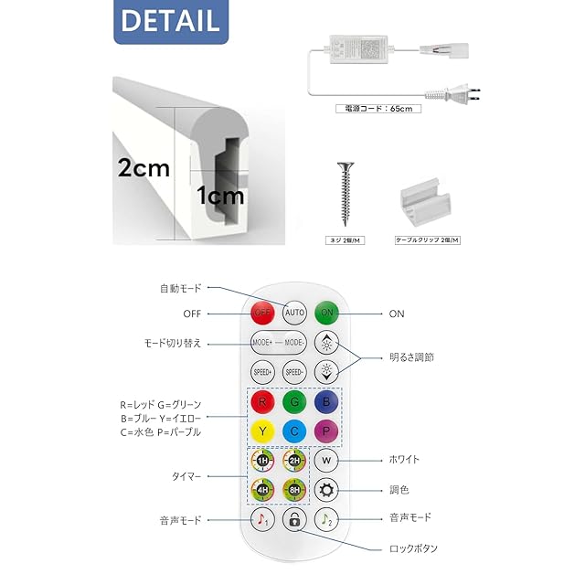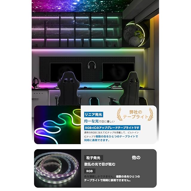 【進化版RGBIC】単純なRGBではなくてRGB+ICのアップグレードテープライトです。通常のRGBに加えてICチップを搭載して、ビルトインICチップで複数の色をひとつのテープライトで同時に表現します。パッケージ内容:LEDテープライト*1、受信器*1、リモコン*1、ケーブルクリップ、ネジ。