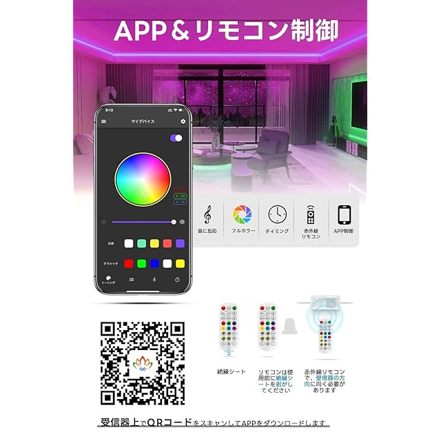 【APP&リモコン制御】APPあるいはリモコンでオン/オフ、明るさ、カラー、タイマー、モードに設定できます。受信器上でQRコードをスキャンしてAPPをダウンロードできます。APPで自分に色を設定できて、フルカラーを自由に変えます。100以上のモードがあり、自分の好みに応じて自由に選択できます。(ご注意:リモコンは使用前に絶縁シートを剥がしてください)