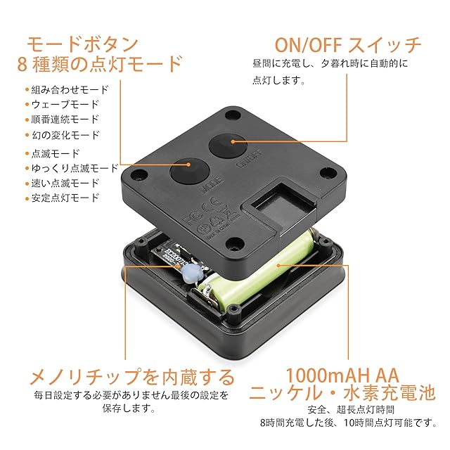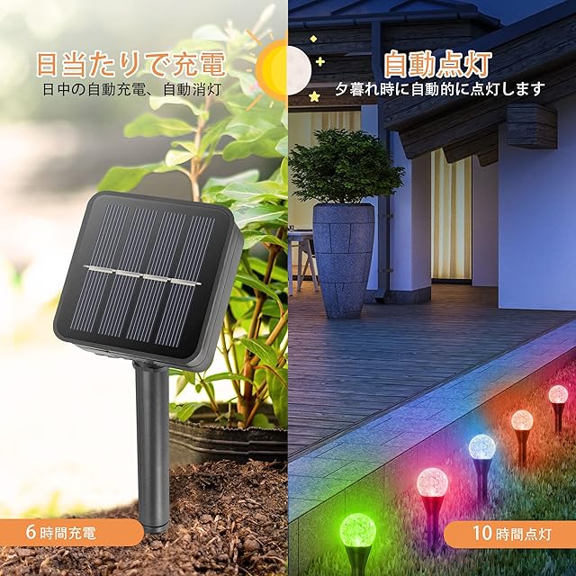 【ソーラー充電で電気代0円!超長点灯時間】太陽光で充電できるので、電気代がかかりません。1000mAHの超大きい充電池を使用して、8時間充電した後、10時間点灯可能です。雨の日などは充電時間が延長されるかもしれません。