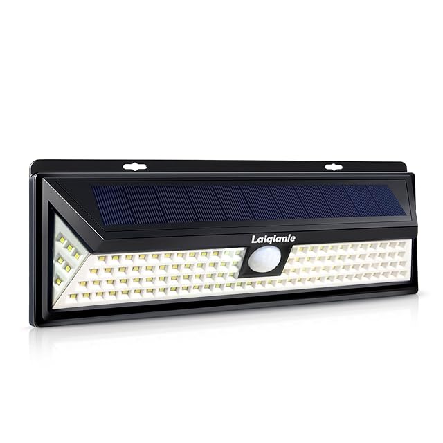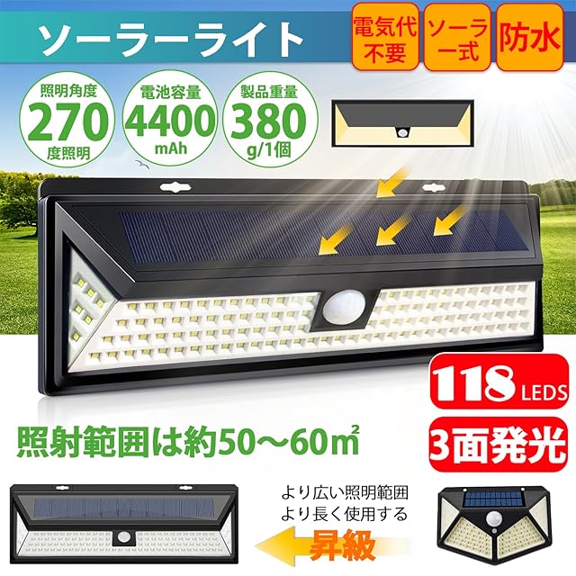 Laiqianle ソーラーライト 屋外 センサーライト 118LED 4400mAhバッテリー 3面発光 超高輝度 人感センサーライト 自動点灯/消灯 三つ照明モード ガーデンライト電気代不要 省エネ IP65防水 明暗センサー 取付簡単 防犯 壁掛け式 防災ライト 玄関/廊下/駐車場/車道/ガレージ/地震/津波/台風 (ブラック-1パック) | つむぎ屋