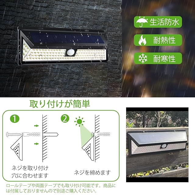 【配線不要・取り付け簡単】この屋外ソーラーライトはIP65防水防塵性能を備えており、雨、雪、霧などの悪天候でもソーラーセンサーライトは損傷しません。ネジ(付属)または両面テープ/ストリップ(別売り)を使用して簡単に取り付けます。通常使用において初期不良、故障、破損、その他の不具合が発生した場合は、対応させていただきますので、お気軽にご連絡ください。