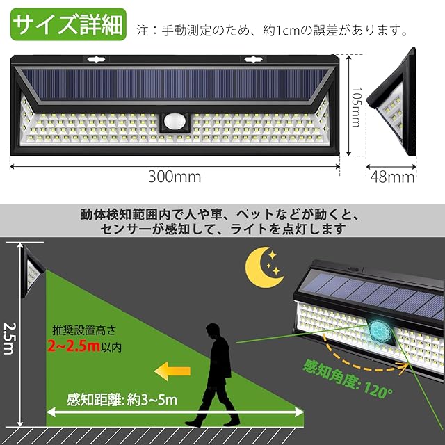 【センサー搭載】ソーラーセンサーライトはPIR人感センサーと120°動体検知角度が搭載されており、暗闇/夜間に動きを検知すると自動的に点灯します。離れると自動的にライトが消えるので、毎回点灯・消灯する必要がありません。