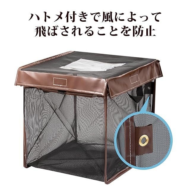 【自立式箱型構造】ボックス型なので、ポリバケツや被せるタイプのゴミネットよりも取り扱いやすい構造となっています。丈夫な骨組みや高密度のメッシュを採用しており、中に何も入れていなくても自立でき、型崩れや変形が起こりにくいです。ハトメが付いており、ヒモを通して柱などにしっかり固定でき、台風や強風で飛ばされる心配もありません。ヒモは付属されていませんので、別途ご用意ください。