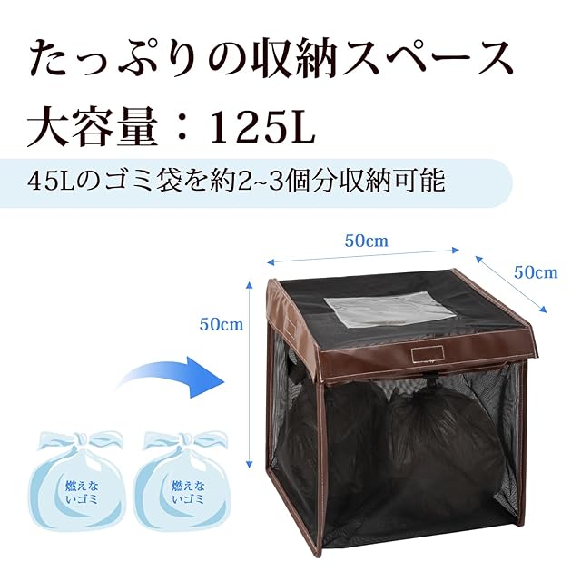 【大容量・折りたたみ式】 125Lの大容量で、45Lのゴミが入ったゴミ袋約2個収納できます。また、折りたたみ式で、使わない時はゴミネットのハンドルをひねる だけでコンパクトに収納できます。更に、軽くて持ち運びも簡単で、配置場所に悩むことなく、ゴミ捨て場までの行き来もラクに行えます。