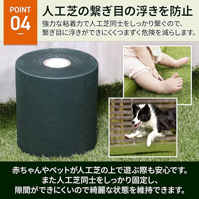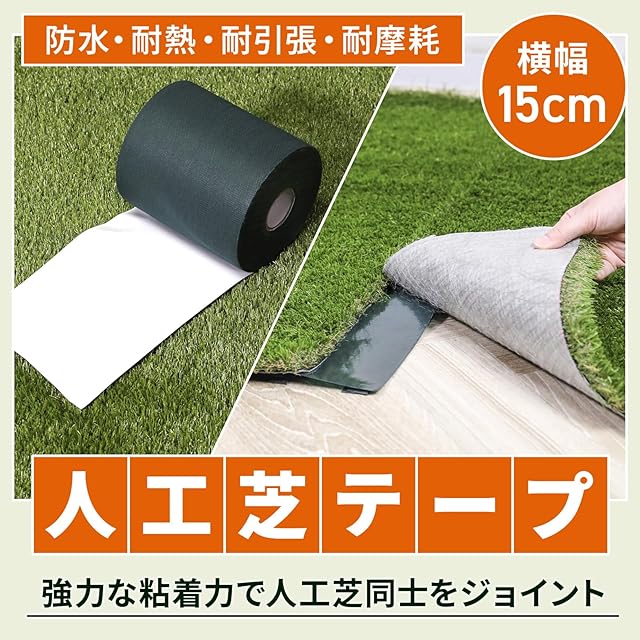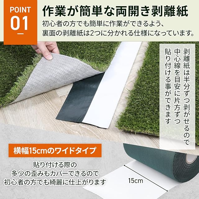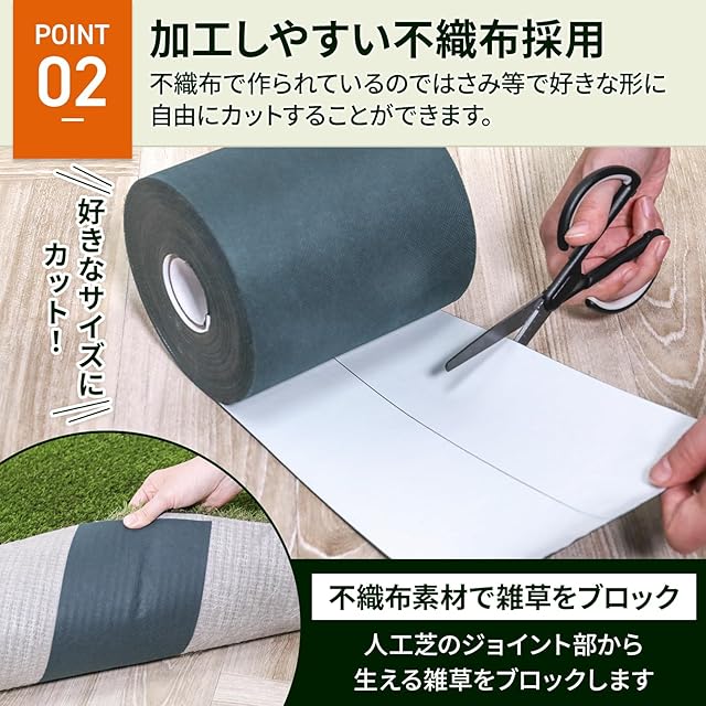 【 ワイドタイプで貼りやすい 】幅が15cmと接着面が広いので、取付時に多少テープに曲がりがあっても簡単に人工芝同士を継ぎ合わせることができます。 不織布のテープのため、はさみ等で自由な形に簡単にカットできます。
