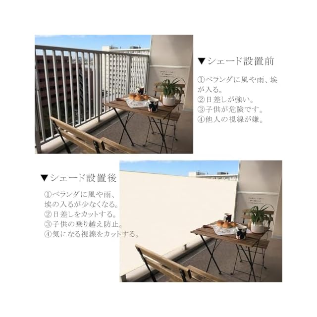 <br>【UV紫外線カット】 紫外線に強く色褪せにくい優れた耐候性。直射日光を遮り、紫外線を約95%カットしてくれます、遮光率は約85%。シェード下の地表温度も下げ、風も通しますので夏でも外で快適に過ごすことができます。窓際に取り付けることで、日差しなどの太陽熱の影響を和らげ、室温上昇を抑制します。エアコンの使用も抑えられますので、節電に最適です。