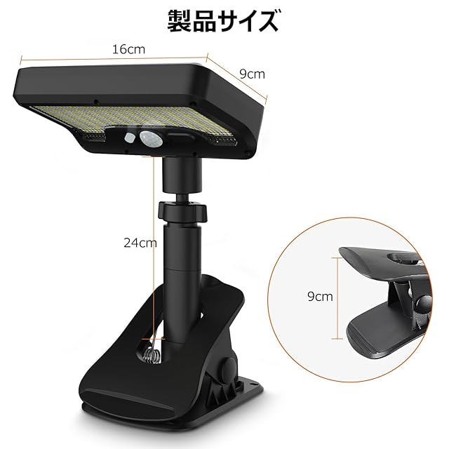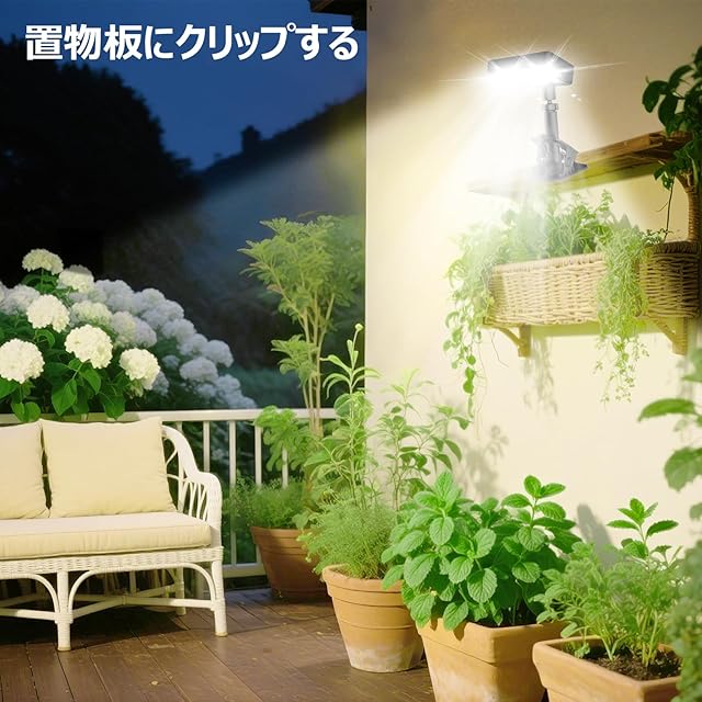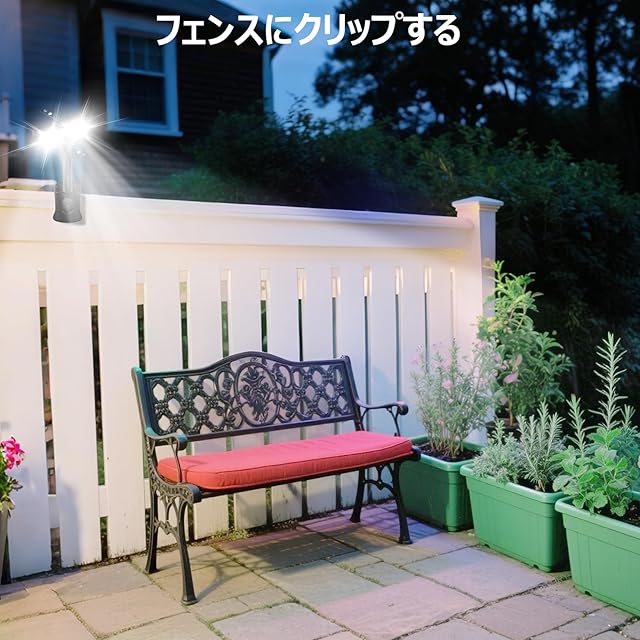 多機能クリップで簡単設置:フェンスやデッキに水平/垂直にクリップ可能。置き台やキャンプテーブルにも設置でき、柔軟なヘッド角度調節で照射方向を自由に調整!