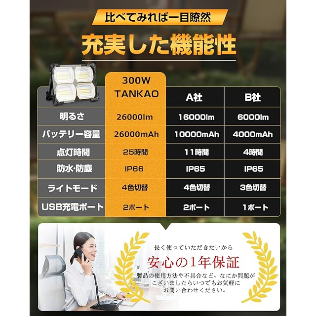 【極高輝・点灯15~25時間】TANKAO 投光器 充電式 led 作業灯 300W 明るさ26000ルーメン 屋外 超高輝 26000mAh大容量電池 残量表示 5種類点灯モード 最強 ワークライト 耐塵耐水 便携式 太陽光発電 磁気設計 キャンプ アウトドア 登山 夜釣り 夜間訓練 作業用 停電 防災 地震 避難対策 (300W) | つむぎ屋
