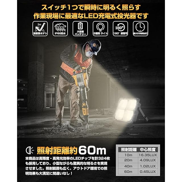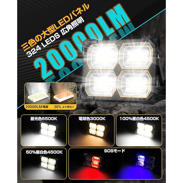 【42000mAh大容量バッテリー・最大30時間連続使用が可能】新世代のLEDライトは使用寿命500,00時間以上に達し、周囲の暗闇を切り開き、夜間であっても昼間のように感じられます。サイズ:Φ230*190*60mm 重量:約2kg(単品) 42000mAh大容量リチウムバッテリーを内蔵しており、電池交換の手間が無し。50%自然色モードで25時間以上、100%自然色モードで15時間連続使用可能!フル充電後、最大約25時間の連続稼働ができます(乾電池次第)。また、USB充電式なので、ACアダプター、モバイルバッテリーなどを利用し、手軽に充電ができます。充電して何回も使える充電式は、環境への 負荷を抑えることができるからです。充電式 led投光器としては、どこでも楽々で持ち運びやすくて、充電が長持ちで週末一泊二日のアウトドア用も安心して使えます。注意事項:ご使用前に完全に充電してください。