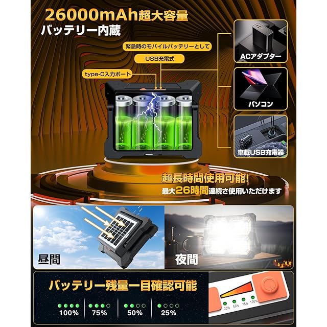【26000mAh大容量バッテリー・最大25時間連続使用が可能】新世代のLEDライトは使用寿命500,00時間以上に達し、周囲の暗闇を切り開き、夜間であっても昼間のように感じられます。サイズ:Φ230*190*60mm 重量:約2kg(単品) 26000mAh大容量リチウムバッテリーを内蔵しており、電池交換の手間が無し。50%自然色モードで25時間以上、100%自然色モードで15時間連続使用可能!フル充電後、最大約25時間の連続稼働ができます(乾電池次第)。また、USB充電式なので、ACアダプター、モバイルバッテリーなどを利用し、手軽に充電ができます。充電して何回も使える充電式は、環境への 負荷を抑えることができるからです。充電式 led投光器としては、どこでも楽々で持ち運びやすくて、充電が長持ちで週末一泊二日のアウトドア用も安心して使えます。注意事項:ご使用前に完全に充電してください。