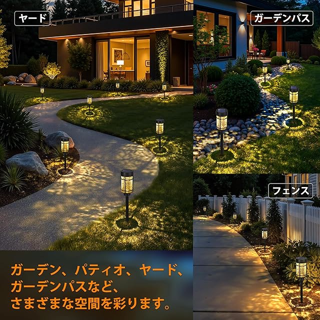 【取り付け簡単・大活躍】:庭用ソーラーライトは配線が不要で設置が簡単です、一人でも簡単に設置のが可能です。ガレージ/玄関/庭、花壇/ベランダ·ポーチ/階段/エントランスなどの室外場所に幅広く使用頂けます!夜のお庭や玄関先を華やかかつ省エネルギーにドレスアップできるガーデンライトです。