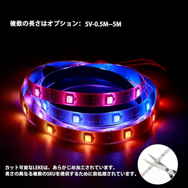 【自由に貼り付けてカットでき】強力な両面テープが付属しており、切断可能(1つのLED),取り付けが簡単。より多くのシーンに適用し、無駄を避けるために、0.5 m-5 mの異なる長さを提供します。コンピュータ、テレビ、USBポートを備えたデバイスに無駄なくインストールできます。5 mのライトストロークを購入して短くカットするのに比べて、当社の製品はより選択されているので無駄が少なく、電源を再購入する手の間が省けます。