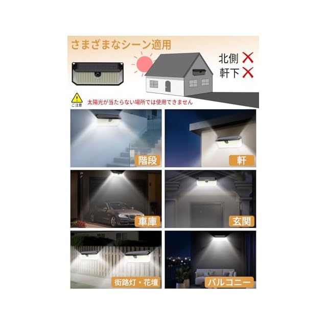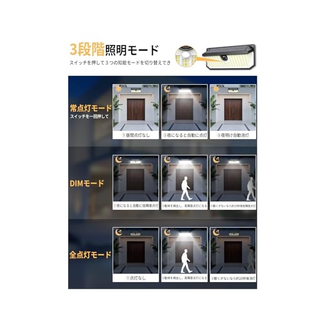 【3 つのモード】屋外用センサーソーラー ライトは、13 ~ 20 フィート以内、120 度の角度で動きを検知する PIR モーション センサーが搭載されています、ソーラーライトのボタンを一回目押すると【常時点灯モード】になる:夜または暗くなると自動的に中程度の明るさで点灯します。二回目ボタンを押しすると【DIMモード】になる:夜や暗くなると、自動的に弱光点灯します。 動きを検知すると、25秒間100%の明るさで点灯し、再び暗くなります。三回目ボタンを押しすると【強光センサーモード】になる:夜間に動きを検知すると、100%の明るさで25秒間点灯し続け、その後自動的に消灯します。当社の屋外センサー ライトは、人、動物、車の動きを検知します。通行人が前庭を通過すると、ライトが検知して点灯し、通行人の道を照らし、他の人に便利です。動物や部外者が庭に侵入すると、ライトが警告として点灯し、庭の安全性が向上します。