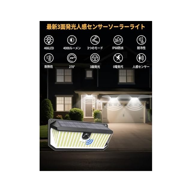 【新世代466個4000LM高輝度LED・3面発光・270°照明】このソーラー ライトは日中は真夜中でも明るい!センサーライトは 自動充電・夜暗くなると自動点灯。466個の高輝度LEDが放つ昼光色4000lmは、従来品の約2倍の明るさで庭全体をくまなく照らします。3方向発光デザインが生む広角270°照明で、死角を徹底排除。防犯性が飛躍的に向上!