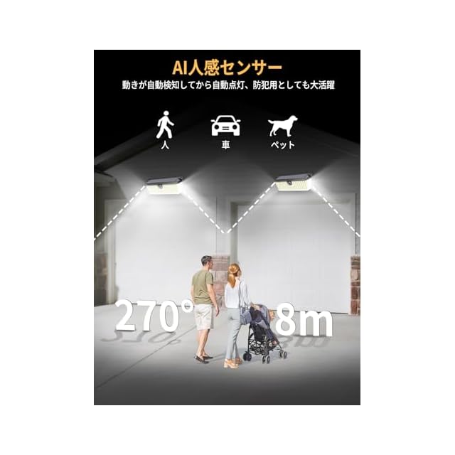 【AI人感高感度センサー・自動点灯・消灯】この屋外 ソーラーライトは帰宅した瞬間に光がお出迎え!8m先から感知する高感度センサーライトは暗がりでふと足を止めた瞬間、人を感知して0.3秒で自動点灯。270°の広範囲&最大8m(他社比2倍以上)の検知性能で、「玄関までの小道」「物置の裏通り」も丸ごとカバー。お子様の夜間帰宅・ゴミ出し時の安全を強力サポート、家帰りに早く検知され、照らしてくれ、暗闇を恐れる人ご安心!