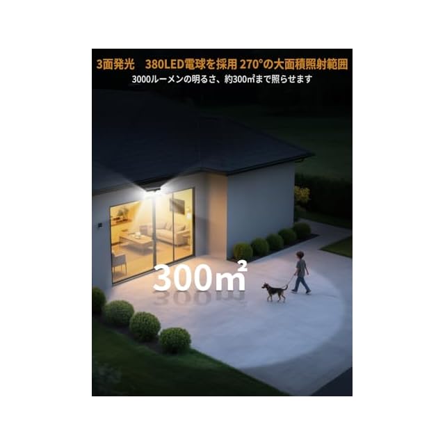 【466個4000LM高輝度LED・3面発光・270°照明】このソーラー ライトは日中は真夜中でも明るい!センサーライトは 自動充電・夜暗くなると自動点灯。466個の高輝度LEDが放つ昼光色4000lmは、従来品の約2倍の明るさで庭全体をくまなく照らします。3方向発光デザインが生む広角270°照明で、死角を徹底排除。防犯性が飛躍的に向上!