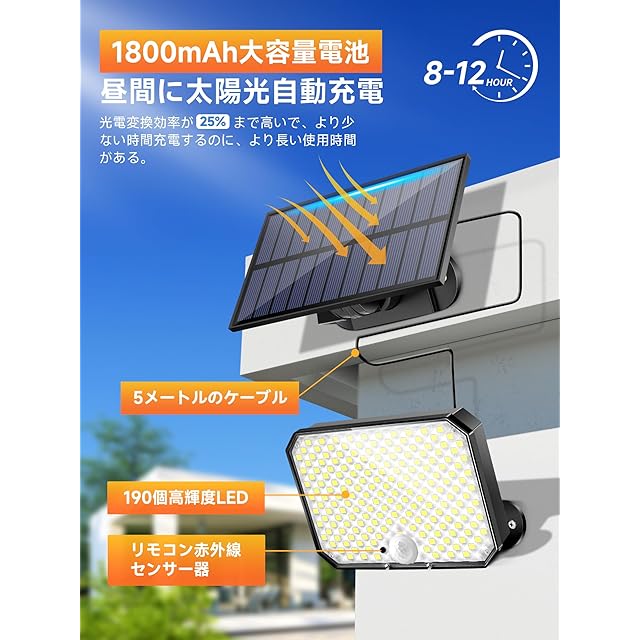 【25%光電変換効率&1800mAh大容量電池】ほかのソーラーセンサーライトと比べて、弊店のソーラーライト屋外、センサーライト屋外は高効率のソーラーパネルを採用し、光電変換効率が25%まで高いです。ほかの人感センサーライト屋外より、もっと短い充電時間で、もっと長い使用時間があります。陰晴定まらない天気でも、高出力のソーラーパネルは依然としてかなりの速度で充電することができる。弊店のソーラーライト屋外とセンサーライト屋外は1800mAh大容量電池を内蔵され、フル充電されたらより長い時間で使用できます。屋外ledセンサーライトと防犯ライトは昼間に自動に充電し、夜の作業時間が8-12時間ほどあります。太陽光発電なので、人感センサーライト屋外は自然の力から生まれたクリーンなエネルギーで環境に優しい。しかも、ソーラーライト室外とセンサーライト室外はゼロの電気代で玄関、軒先、庭、ガーデン、ガレージ、駐車場など照らします!