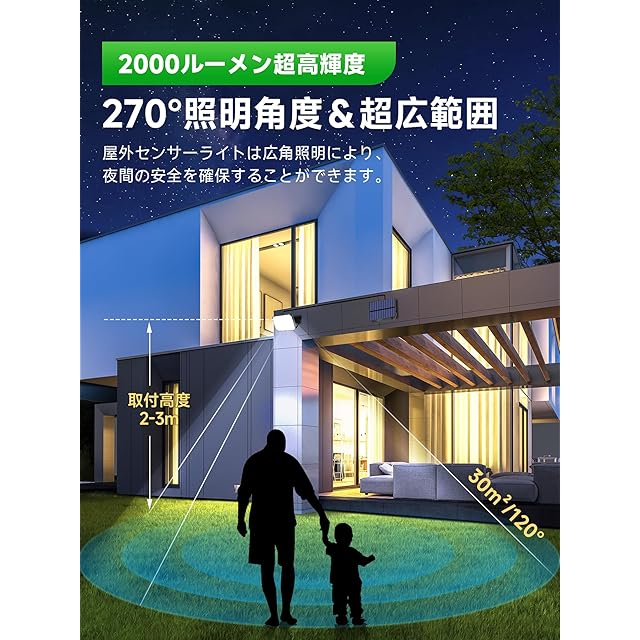 【2000ルーメン超高輝度のソーラーセンサーライト】屋外センサーライトの輝度不足を心配していますか?少しの心配も要りません。人感センサー付きのソーラーライト屋外、センサーライト屋外は190個超高輝度のLEDがあり、2000ルーメンの高輝度に達することができる。従来のソーラーライトと比べて、5メートルのケーブルを付きの分離型の人感センサーライト屋外は設置範囲が広くて、充電がもっと便利です。ソーラーセンサーライトは270°の広角照明が可能で、夜間センサー照明の範囲が大幅に広くなります。昇級版LEDチップなので、じんかんせんさーライト屋外は低発熱、低赤外線・低UVなので、虫も集まりにくくなっています。屋外センサーライトは広角照明により、照明利用率を高め、夜間の安全を確保することができます。防犯ライト、防犯灯、外灯、野外ライト、玄関ライトとして、屋外センサーライト、ledセンサーライトは玄関、軒先、庭、廊下、ガーデン、ベランダ、駐車場など場合に大活躍!