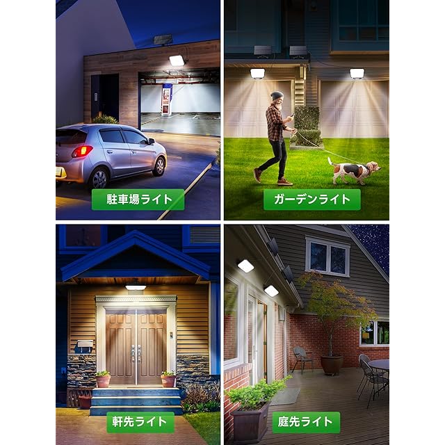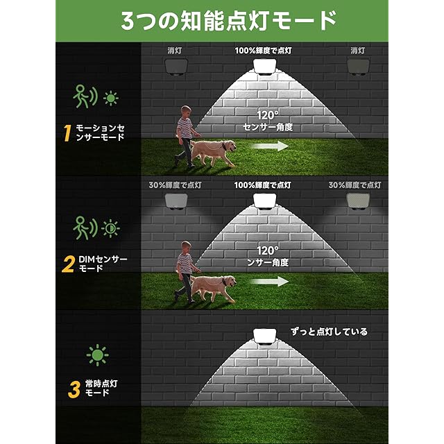 【3つの知能センサー照明モードを搭載する屋外センサーライト】昇級版の屋外ledセンサーライトは明暗センサー検知器と人感センサー検知器を搭載され、3つのセンサー照明モードがあります。【常時点灯モード】夜や暗くなると、ソーラーセンサーライトは自動的に低度輝度で点灯しています。昼間と明るい場所では消灯します。【DIMモード】夜や暗くなると、屋外センサーライトは自動的に低度輝度で点灯します。人や動物の動きを感知すると、屋外センサーライトは自動的に高輝度で点灯になって、動きがなくなると約20秒後低度輝度で点灯状態に戻ります。【センサーモード】夜や暗くなるんと、動きを感知すると、センサーライト屋外は自動的に高輝度点灯になって、動きがなくなると約20秒後消灯になります。お使用の場合によって、センサー照明モードを選択でき、とても便利です。