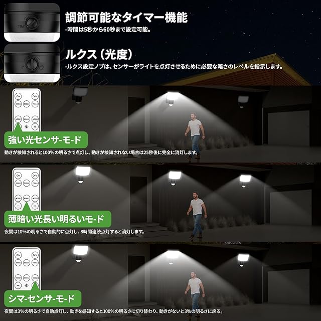 【調節可能なタイマー機能と光センサー】センサーライトには2つの回転ボタンがあります。ひとつはLUX(光量)ルクス設定ノブ、 センサーが点灯するために必要な暗さを指示します。もう一つはタイマー回転ノブで、センサーモードでライトが点灯している時間を設定できます。