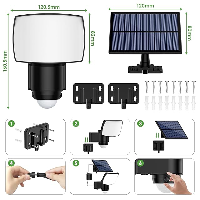 仕様 防水性能:IP65 充電時間:約6~8時間 作動時間:約8~10時間 バッテリー:リチウム電池3.7V 1800mAh ソーラーパネル(L×W×H):120mm×90mm×5mm 太陽ライトのサイズ: 121mm * 134mm * 160.5mm 動力源: 太陽動力を与えられた 太陽電池パネル: 5.5V/1.5W センサー角度:120 設置高さ: 2.5 - 3M 検出距離:6~8M 光源:115 SMD 2835 LED 製品重量:374g CCT:3000K/5000K/7000K