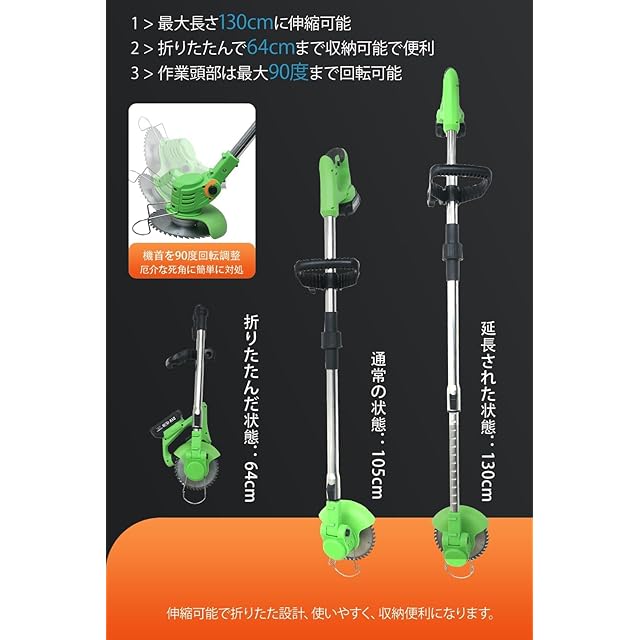 【柔軟な伸縮、便利な収納】ステンレス製伸縮ポールは、自在に伸縮し、最大で140cmまで延長可能であり、折りたたむとわずか110cmになり、充電式草刈機の収納と持ち運びが容易です。身長に応じて調整でき、腰部と脚部の負担を軽減します。充電式草刈機を折りたたんだ状態では、わずか64cmで、車に持ち運びやすく、場所を取りません。
