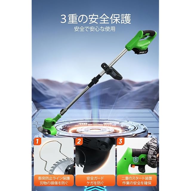 【角度調整可能、多重保護】作業ヘッドは最大90度まで回転し、さまざまな地形と用途に適応します。二重起動装置が充電式草刈機の作業の安全をし、保護カバーが雑草の飛散を防ぎ、底部の防衝撃線が刃物を保護します。安全で便利な充電式草刈機の刈り込みの楽しみをお楽しみください!