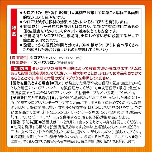 有効期間は2年間:設置してから2年間有効です。(シロアリが紙エサを食べつくしたものは新しいものと交換してください。)