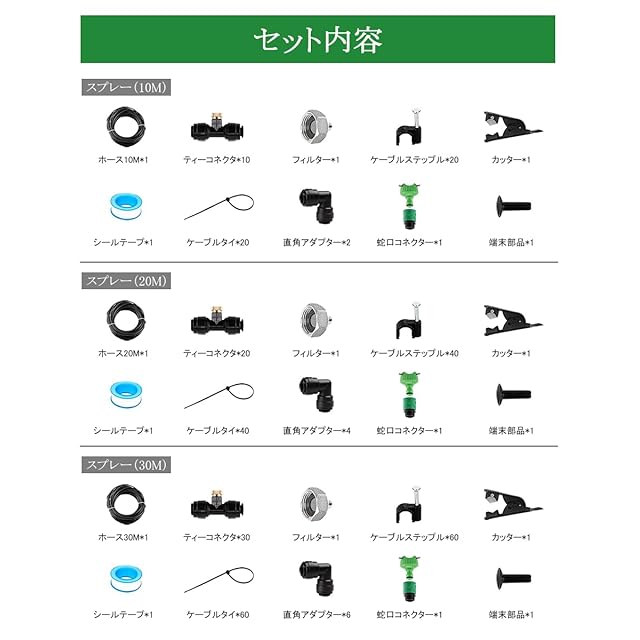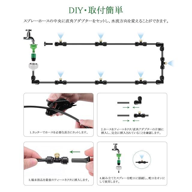 【装着簡単】散水ホースセットは10m/20m/30mメートルで、必要に応じて自由に長さをカスタマイズできます。スプレーホースの中央に直角アダプターをセットし、水流方向を変えることができます。このミストシステムは一度に異なる植物の水需要を満たすこ とができます。ほとんどの家庭用水圧に適しています。結束バンドも付属しているので、柵や竿に設置してご使用いただけます。