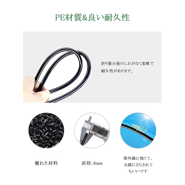 【ミストシャワー】プラスチック製のノズルをブラスにアップグレードし、従来の散水よりも広い面積をカバーし、湿度を効果的に高めます。散水ホースは外径:6mm/内径:4mm、強い日光の下で壊れやすい黒いプラスチックチューブと比較して、弊社のPEチューブは柔らかく、普通な黒いの2倍の耐用年数を持っています。