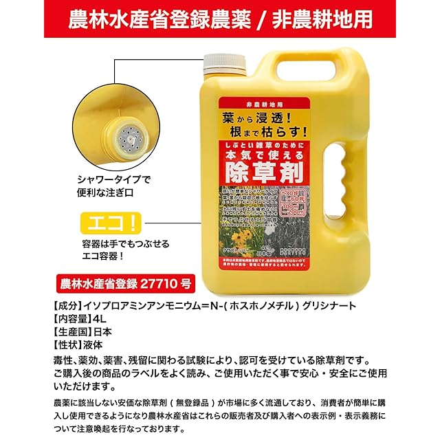 根まで枯らす 除草剤 非農耕地用 本体ボトル シャワータイプ 4L 液体 強力 業務用 雑草対策 散布 大容量 スギナ しぶとい雑草のために本気で使える