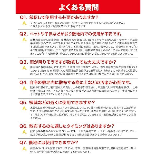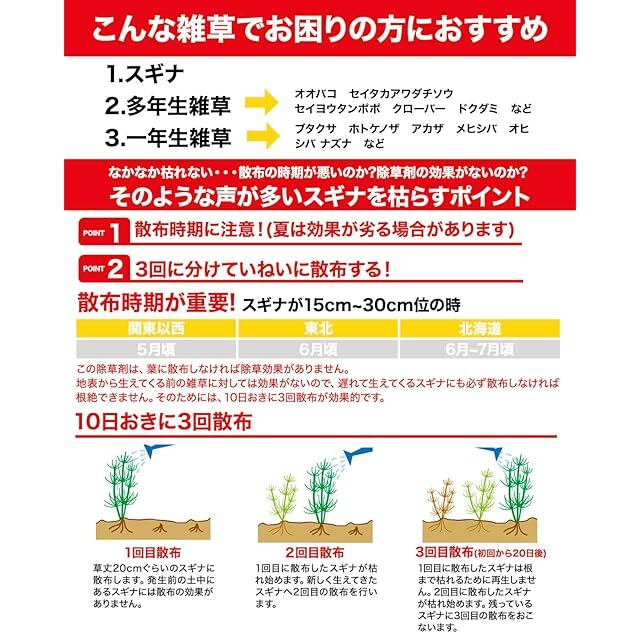 【✅適用雑草名】・スギナ ・多年生雑草(オオバコ、セイヨウタンポポ、セイタカアワダチソウ、クローバー、ドクダミなど) ・一年生雑草(メヒシバ、オヒシバ、スズメノカタビラ、スズメノテッポウ、エノコログサ(ネコジャラシ)、カラスムギなど)