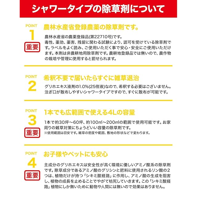 【✅散布しやすい注ぎ口シャワータイプ】扱いが簡単な注ぎ口がシャワータイプになっているので、広い場所にすばやく散布できます。詰め替えたり別途散布器を用意する必要がありません!4Lで約100~200平方m散布できます。(約30~60坪)