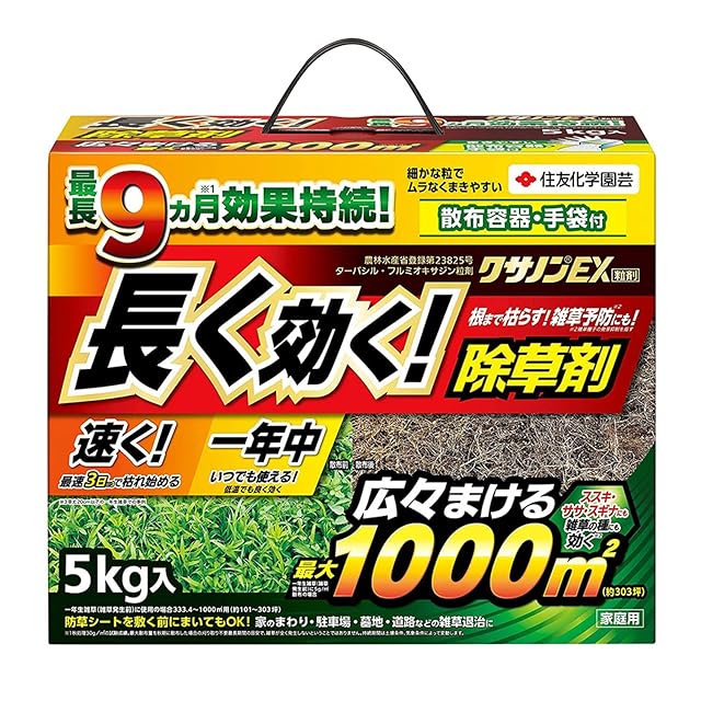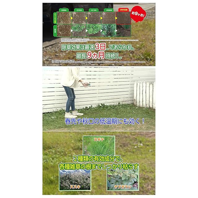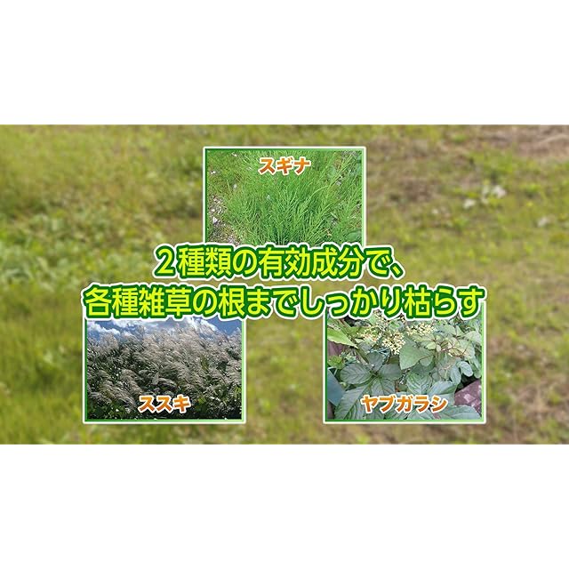 特徴:2種類の有効成分で、スギナ・ススキ・ヤブガラシなど各種雑草の葉や茎だけでなく根までスッキリ枯らします。