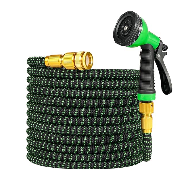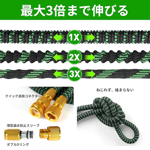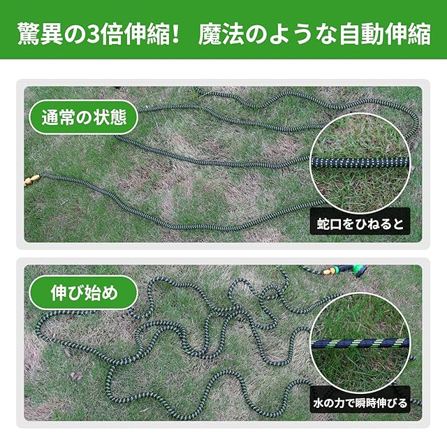 商品名:伸縮ホース 3倍拡長 2.5m→7.5m 伸びるホース 10モード散水ノズル付 軽量 耐凍結設計 洗車 ガーデニング兼用 散水 コンパクト収納 玄関・ベランダ・庭対応 大掃除 水撒き 耐破裂 ダークグリーン