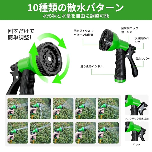 【10つのモード切替が出来る散水ノズル】 洗車からガーデニングまで。シャワー/ミスト/集中ジェットなど10段階水流切替可能。車の汚れ落としから繊細な植物への水やりまで一本で対応。
