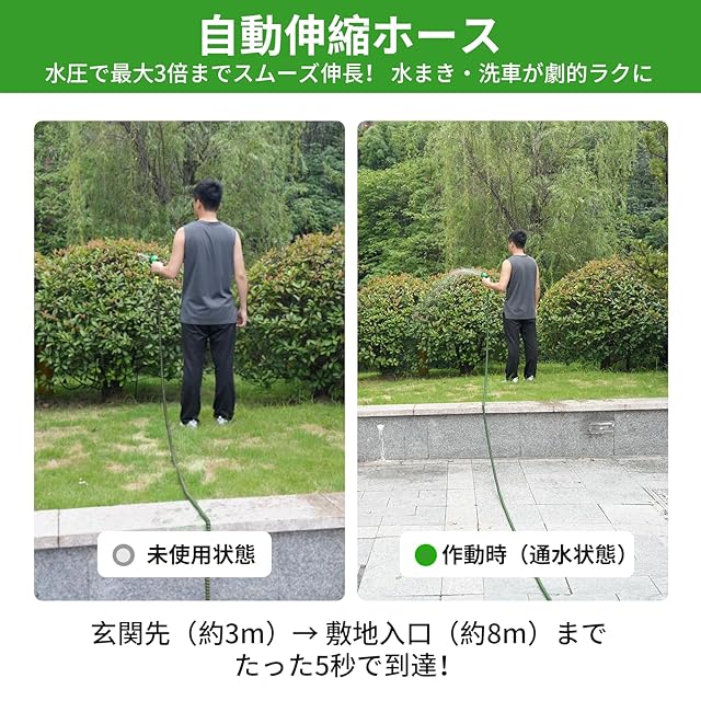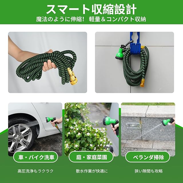 【3倍伸縮するで省スペース収納】 2.5m→7.5mの伸縮ホースで玄関・ベランダの狭い場所でもスムーズに展開。コンパクト収納可能な軽量設計で女性や高齢者も楽に操作できます。