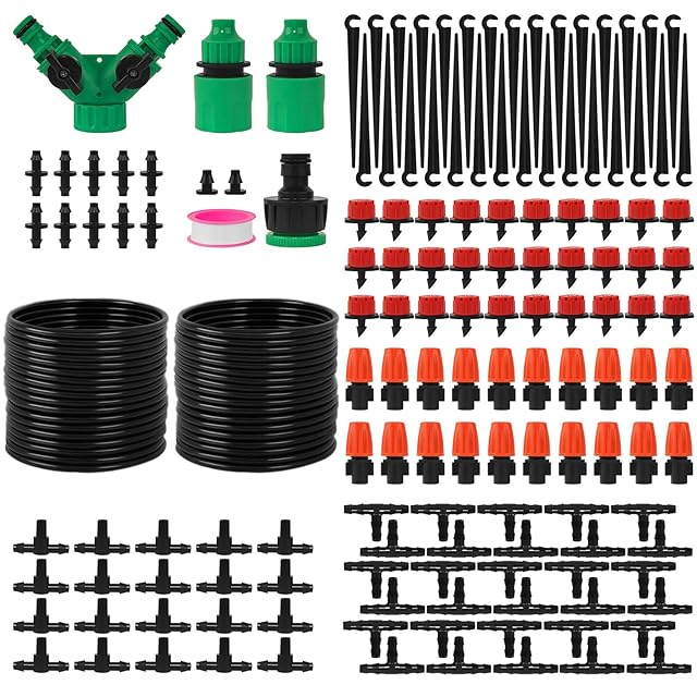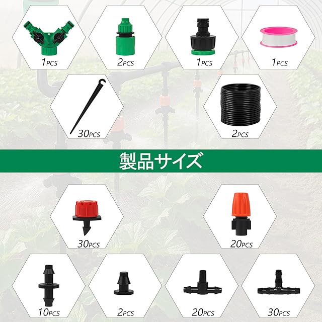 セット:1/4インチPEホース15m*2、テフロンテープ*1、1/4" クイックコネクター*2、2ウェイホースセパレーター*1、タップコネクター*1、赤いスポイトノズル*30個、ミストノズル*20個、支柱*30個、エンドキャップ*2個、ティーコネクター*30個、4mmフラット・ティー・コネクター*20個、シングルコネクター*10個