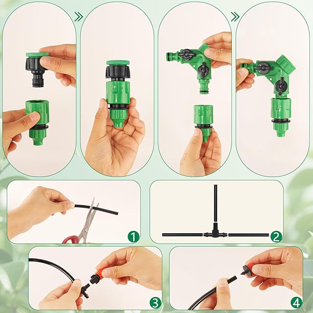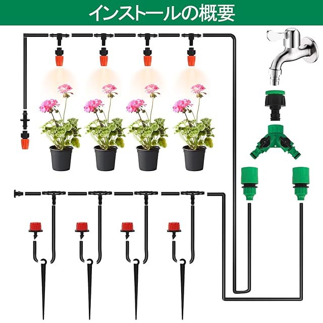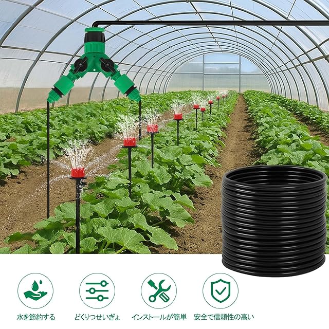 【適用範囲】この灌漑システムは、霧吹き、芝生の灌漑、テラス、花畑、野菜の灌漑、屋根の冷却、灌漑、農業、野菜、温室、花壇、プールの霧吹きと冷却灌漑に適しています。(注:自動水やりタイマーが別売りです)