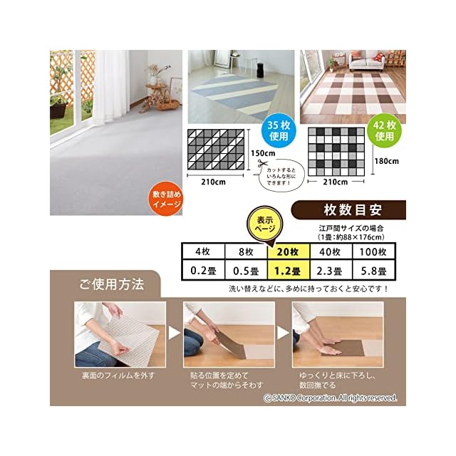 【1.2畳分】 サイズ : 20枚組〈約1.8㎡〉 30×30cm(厚み4mm)、重量:50g(1枚)