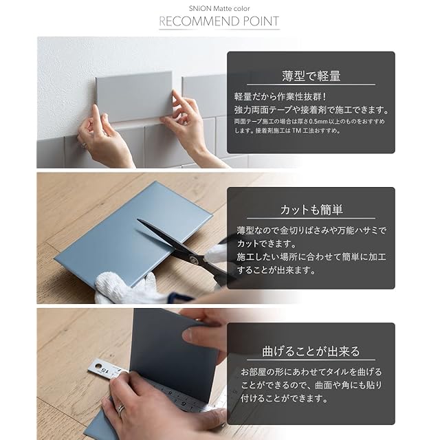 ■マットカラーは塗料の成分により端の塗装が剥がれやすくなっております。ご了承ください。 ■薄く柔らかく曲げやすい製品です。折り目がつくと戻りません。取り扱いにご注意ください。 ■カットの際、切り口で手や指をケガをする恐れがあります。取り扱いにはお気をつけ下さい。 ■貼る前に貼る壁面のほこりや汚れを落としてください。汚れが残っていると貼りつかない場合があります。 ■施工中の傷や汚れを防ぐため、保護フィルムは必ず施工後に剥がしてください。施工前に端を浮かせておくと施工後剥がしやすくなります。 ■当製品は屋内用です。屋外の壁面にはご使用になれません。