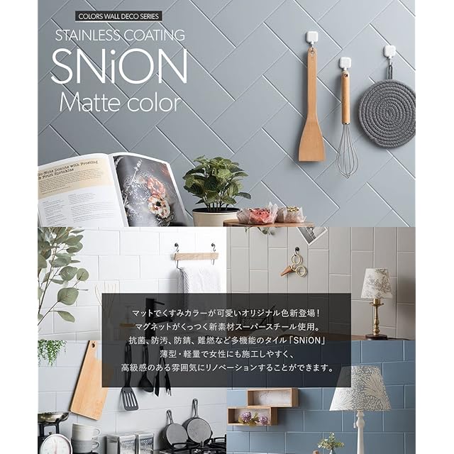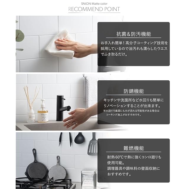 ■表面に傷がつくため、研磨材入りのナイロンたわし等のご使用はおやめください。 ■壁面用となります。床面への施工はできません。 ■コンロ周りへの施工は、鍋底から火が伝う可能性があるためバーナキャップより30cmほど離した場所に設置してください。火元など高温になるものから必ず10cm以上離してください。 ■耐熱温度は60℃までです。 ■カットサンプルのご用意はございません。2枚入りをご購入ください。 ■取り付けた磁石付きアイテムがずれてくる場合は磁石の耐荷重を超えています。磁石の耐荷重をお確かめください。 ■保護フィルムが濃いブルーの場合があります。フィルムの端をめくっていただき本体の色をご確認ください。
