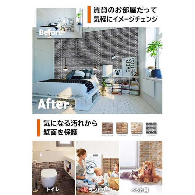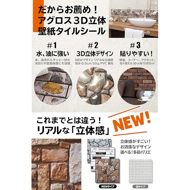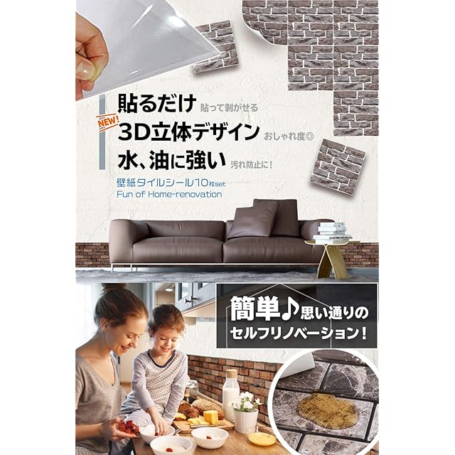 【リアルな立体感】これまでの壁紙とは違うリアルな「立体感」が特徴です!水、油汚れにも強くキッチンや洗面所、トイレでも大活躍。また、30cm * 30cmの扱いやすいサイズなのでカットせずにすぐに貼り付けられます。