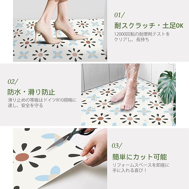 ✅ 素材の利点:1) 防水&抗菌防カビで、滑り止めの等級はドイツR10規格に達しており、洗面所、トイレ、浴室 、キッチン、床暖房、玄関、あらゆる床面に安心して使用できます。2) 12,000回の耐摩耗試験をクリア、抜群の耐摩耗性を持つ、土足OK、長持ち。猫の爪とぎでも傷つきにくく、ペットのいるご家庭にもおすすめです。3) SGS認証の四大品質試験に合格し、安全で環境に優しい素材です。