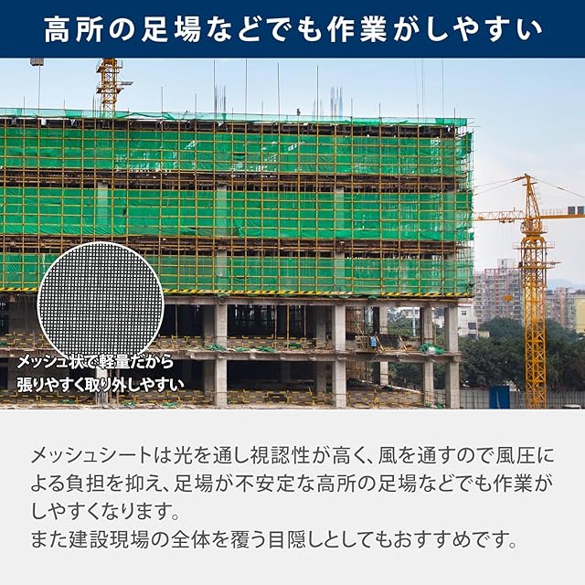 【メッシュ状】メッシュ状で軽量のため、張りやすく簡単に取り外しができます。また、足場への風圧による負担を抑え、足場が不安定な野外などでの作業におすすめです。軽量・遮光性に優れており、工事の作業性を高めます。