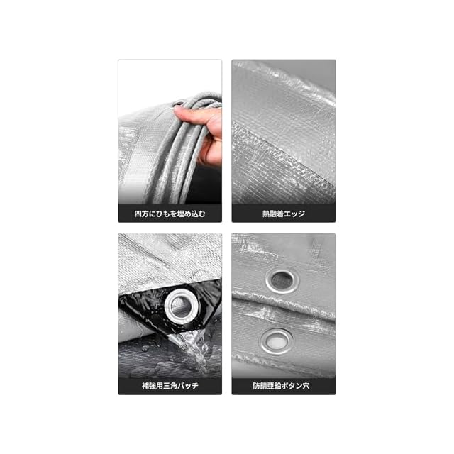 多用途で便利なハトメ付き 四隅にハトメ(金具)を標準装備。ロープや結束バンドで簡単に固定可能で、屋根シート・テント・荷物カバーなど様々なシーンで活用できます。