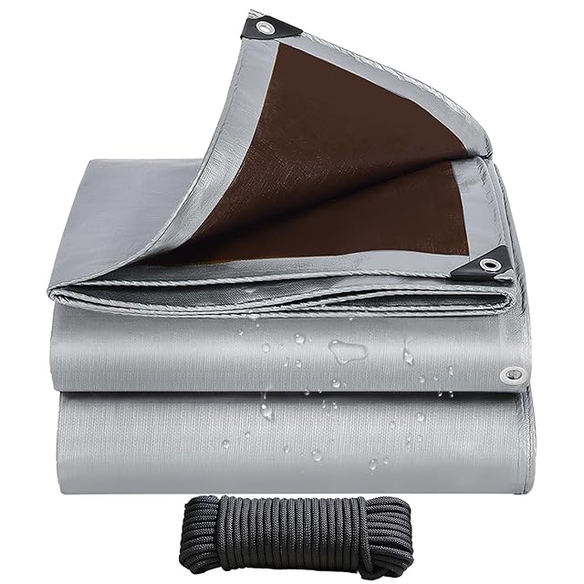 【商品仕様】防水シート シルバーシート #4000 厚手 防水 屋外 屋根 バルコニー用。防水シート実際のサイズ:約5.8m*7.9m、じゅうりょう:約8.6キログラム。商品の厚さ:約0.4mm、両面カラー:シルバーとコーヒーカラー。複数のサイズ、寒さ熱さに耐久があり、耐久性、用途が広い。直径5 mm、長さ約10 mの黒いひもを贈ります