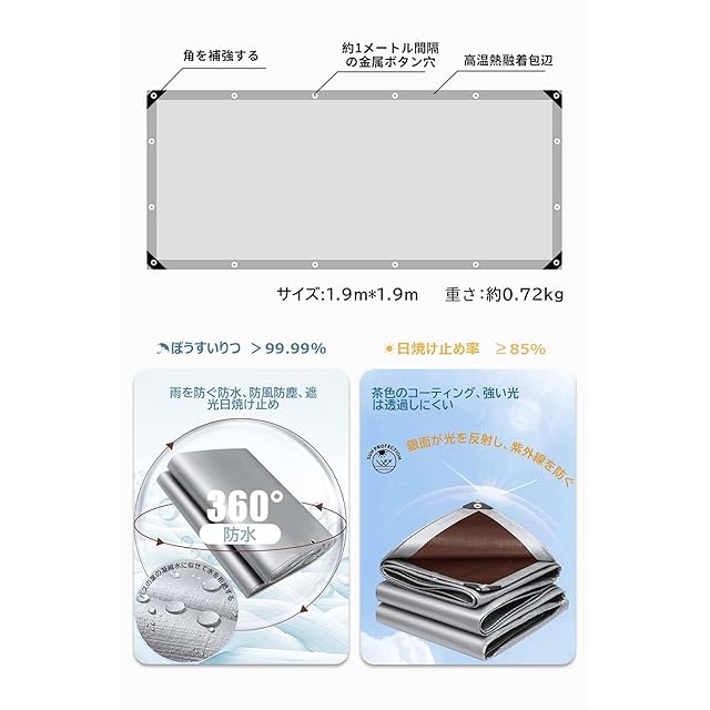 防水シート シルバーシート #4000 厚手 防水 屋外 屋根 庭 バルコニー 遮光 UVカット 台風・ゲリラ豪雨対策 キャンプ 園芸 温室カバー 保温性 耐寒性 耐久性 両面防水仕様 ブラックロープ付き (シルバー,1.9m*1.9m) | つむぎ屋