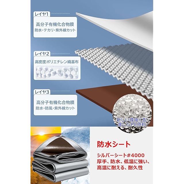 【商品仕様】防水シート シルバーシート #4000 厚手 防水 屋外 屋根 バルコニー用。防水シート実際のサイズ:約3.8m*4.9m、じゅうりょう:約3.6キログラム。商品の厚さ:約0.4mm、両面カラー:シルバーとコーヒーカラー。複数のサイズ、寒さ熱さに耐久があり、耐久性、用途が広い。直径5 mm、長さ約10 mの黒いひもを贈ります